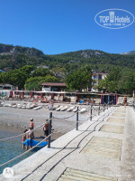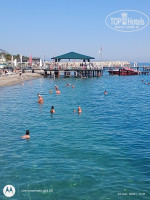 Пляж прекрасен. Удобно спускаться в воду с пирса, хорошая лесенка. Море чистое, хотя в один день нанесло грязи и купаться было неприятно. Лежаков хватало.