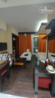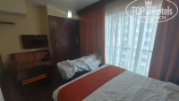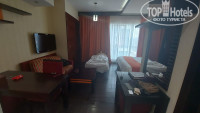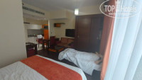 Номер конечно уставший, немного тесноватый на троих, нам привезли доп.раскладушку для дочери, сами спали на двуспальной кровати. кроме них в номере есть еще диванчик, стол, стулья и кухонный гарнитур, отель все-таки апартаменты. мы переставили диван, как нам было удобно и стало комфортнее. Вся техника рабочая, в шкафу нашли утюг с гладильной доской.