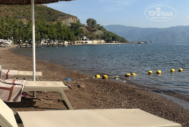 Локация: просто отличная. Сам поселок Ичемлер достаточно симпатичный, красивая бухта, горы. Для меня огромным плюсом было наличие променада: набережная протяженностью почти 7 км до центра Мармариса, вдоль моря, в соснах, можно гулять, кататься на вело. В другую сторону еще минут 20, мимо кафешек и ресторанов, где вечерами весь движ. В пешей доступности вся активность, магазины. Прямо около отеля со стороны пляжа небольшой маркет и с западной стороны супермаркет А101 сетевой. До Мармариса удобно добираться на автобусе за 50 лир (15 минут), остановка около отеля. Либо по морю на катерах-такси за 250 лир.