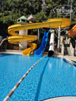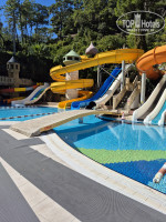 Подъездная дорога к отелю одна, и она заканчивается отелем (корпусом А). Сквозного проезда нет. Далее только корпуса Д и Е, за ними аквапарк. От аквапарка и начнем. Здесь есть лежаки, здесь есть бассейны, здесь есть горки как для малышей, так и подходящие взрослой публике. Но в октябре бассейны тут (как и везде по отелю) были холодными, подогрева нет.