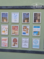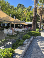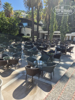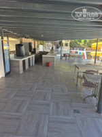В обоих корпусах ресторана также столы/стулья. За корпусом С – который у подъездной дороги, крытая кофейня с пирожными, бутербродами и круассанами. В корпусе В рядом с бассейном – еще один бар. В октябре не работал, краны замотаны пленкой.