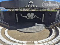 Слева изгибается побережье, до самого конца отельной территории. Справа небольшой амфитеатр, рядом с ним бар со столами, стульями и сценой, который работает только в ночь. В этом баре по вечерам проводятся всякие бинго и пародии на дискотеки. Днем тут пусто.