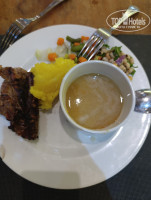 Еда достаточно разнообразная, фруктов не было, тортиков и прочих излишеств, мясные блюда давали порционно. Даже правильно, потому что посмотреть,как люди обычно набирают кучу всего и потом столько еды выбрасывают. Вода горячая, холодная, напиток сладкий есть. Даже раз была курица на гриле. Сотрудники быстро убирают со стола. Вода питьевая необходима даже для чистки зубов.