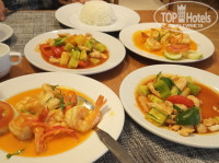 Питание брали HB, и не пожалели! Кормят очень вкусно и много. Завтрак - традиционный, небольшой шведский стол. А вот второй приём пищи - это отдельная песня! Можно придти в любое время с 12 до 21 часа, и пообедать или поужинать, кому как удобно. Выносят меню на русском языке, в котором 5-6 вариантов тайского обеда. И столько же - европейского. По выбранному номеру сета приносят еду достаточно быстро. Но её приносят столько!!!! При наличии шведского стола, никогда бы не пришло в голову накладывать столько тарелок! А приносят вот что. Сначала кофе или чай, в зависимости от выбора. Потом суп. Я брала тайское меню. В нём были такие вкусные супы, что пальчики оближешь! Больше всего понравился Том Кха - на кокосовом молоке с лаймом и креветками. Мама выбирала европейское меню, в нём ей понравился сет с итальянским томатным супом. Потом выносят овощную тарелку. Потом каждому по два вторых! Да! Каждому по два полноценных огромных вторых! Это были блюда из курицы, свинины, рыбы. С гарниром и овощами. Отдельно каждому ставили по тарелке с пирамидкой риса! Съесть всё не представлялось возможным. Увы, много оставляли. Не влезало. И в конце - фрукты и мороженое. Наедались так, что не хотелось есть ещё сутки!