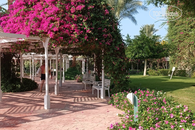 Само название отеля Desert Rose - Роза пустыни очень подходит отелю. К сожалению в ходе реновации территория отеля в какой-то степени потеряла свой шарм: уменьшилось количество цветов вдоль дорожек, часть деревьев и кустарников погибло. Куда-то исчезла непередаваемая ночная подсветка пальм в центральной части отеля. Вместе с тем очень хорошо благоустроили территорию пляжа, который теперь выглядит чудесно как днём, так и в вечернее время.