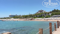 Пляж: Не 1 - первая линия, дорога до пляжа занимает минут 7 пешком, ездят машинки довозят кому надо. Через дорогу, спуск к морю. Пляж песок, заход в море плохой, много камней и плиты!!! Местами острые. Мы об этом знали из других отзывов. Поэтому уходили влево на пляж другого отеля, там дно песок и нет камней и плит. На пляже есть причал, там есть бунгало за деньги и бесплатные лежаки, бар с напитками. Рядом с пляжем есть кафе от отеля где можно пообедать, по мне обычная забигаловка дяди Вани. Тенты не везде висят, поэтому в жару в пекло там сидеть без тентов невозможно. Приходилось либо двигать столбы в тень, либо искать где свободно, чтобы сеть пообедать. Еда в кафе на пляже скудная, как в обычной столовке, супов нет, в основном картошка фри, курица, овощи. Не очень! Спасал там персонал на напитках, добродушная девушка была. Развлечения парашют, банан, катеры , лодки, байки.