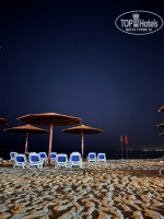 Чистый, песчаный, с пологим входом в море. Удобно с детьми. Волн за период нашего пребывания не было. Разливов нефти или медуз тоже. После 9 утра найти свободные шезлонги, а тем более несколько, очень сложно. Это вынуждает гостей возвращаться к так раздражающей традиции бросать полотенце на какой-нибудь шезлонг пораньше и забывать про него на какое-то время.