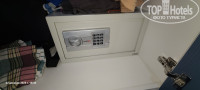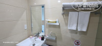 В номере две кровати - двуспальная и полуторная. Также есть встроенный шкафчик с плечиками, тумбочки, столик с большим зеркалом, стульчики, электронный сейф, тапочки.