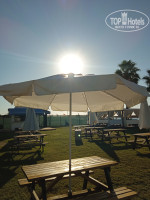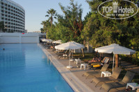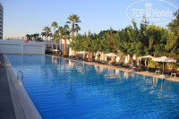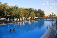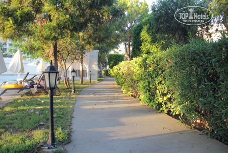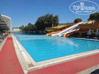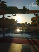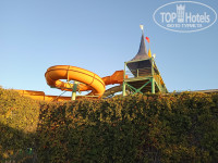 Территория отеля совсем небольшая, очень чистая и ухоженная. Пляж – мелкая галька. Вдоль дороги на пляж практически один большой и длинный бассейн, условно разделенный на зоны. В начале бассейна (ближе к корпусу отеля) – релакс зона с двумя ваннами с гидромассажем, потом скажем так просто бассейн (это самая большая часть), потом горки для взрослых, а уже ближе к морю аквапарк для детей. Надо сказать, что горки для взрослых очень высокие и захватывающие. Пожалуй, таких высоких я ни в одном отеле раньше не встречала. Не удержалась и скатилась на них несколько раз с большим удовольствием. Детский аквапарк тоже был очень хорош. Много горочек, грибочков и разных забавных зверушек для детей любого возраста. Единственный для меня минус был в том, что вода в бассейне была намного прохладнее воды в море и лично для меня была просто холодной так, что купаться я в нем не могла, а только быстренько окунуться.