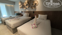 Номер: новый Delux 45 кв.м. три просторные и удобные односпальные кровати, минибар, все новое, единственный минус - раздвижной шкаф, он конечно странный, если один что -то достает никому уже в него не попасть, это конечно мелочь, но иногда сильно раздражало. Окна выходили на соседнюю стройку в 8 утра начиналась работа, кто любит подольше поспать не совсем удобно, но зато вечером тишина, у кого окна выходили на бассейн там наверно было шумновато. В общем тут дело вкуса, но за вид на бассейн отдельная плата.