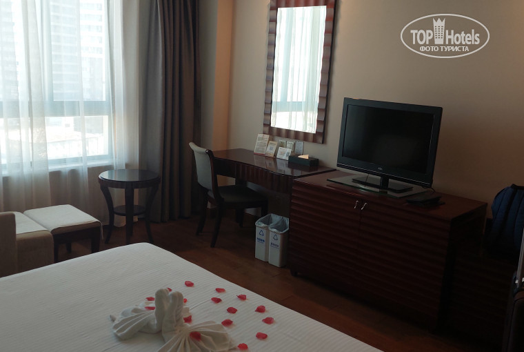 Номер норм, мебель не пошарпаная, сан комната "уставшая", но не критично. В номере нет посторонних запахов, Бельё постельное, полотенца меняли каждый лень, есть халаты и сланцы, в тумбочке под телевизором лежат пляжные полотенца, которые меняли тоже каждый день. Вода, чай, гель, шампунь, мыло и тд давали каждый день. Мы на кровати каждый день оставляли шоколад Алёнка, когда просили дополнительно воду, давали без проблем. Вид из номера на город. Кондиционер работал без проблем, по телевизору шли 2 русских канала. На 8 день сломался холодильник, сказали на ресепшен, сразу принесли новый.