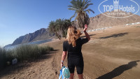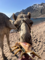 Для неумеющих плавать и детишек удобного входа в море нет - камни. В прилив в принципе можно зайти с любого места, заходишь по колено, ложишься и плывешь. Отлив один раз только был приличный, когда оголились кучей наложенные камни в виде ворот, куда во многих отзывах советуют заходить. Ориентировочно напротив второй мусорки со стороны пустыни и забора у кромки воды. Снующие детишки бедуинов с бусиками - местный колорит, специально купила у них, также угостила сладостями и бутылкой воды. Верблюды ходят, бегают, и даже убегают от погонщиков за специальным ограждением у воды и нам не мешали, наоборот интересно за ними наблюдать. Прокатиться на них - копейки и удовольствие. Носила им лепешки. Собаки есть, но они в основном лежат в теньке, отгоняют детей бедуинов и никому не мешают.