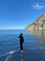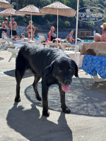 Пляж - ужасного вида бетон, на котором старые лежаки и матрасы с запахом псины. Кстати, на пляже есть спасатель - собака))) Но пес милый, никого не трогает. После очередного шторма лестницу в море совсем раздолбало, спускались по скелету из арматуры которая осталась от лестницы.