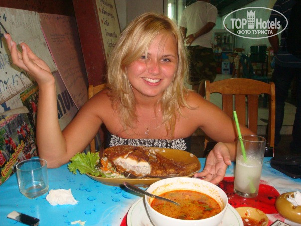кафе: через дорогу от отеля, куча кафешек, не очень потребного вида, но! я много читала про отзывы русских кафе типо "Медведь" и "Смак" и не много не понимаю зачем ехать в другую страну и жрать пельмени с борщом? раз два, но не постоянно же. да и цены там достаточно высокие если сравнивать с другими. мы тоже как прилетели собирались туда, но как перешли дорогу, там кафешек 6-7, которые и неотличишь друг от друга, и решили выбрать там где сидит много русских..и из 6-7 кафешек всего одна кафешка где все столы заняты, а с четом остальные кафе все пустые, в том числе и медведь...и не пожелели ни на минуту!!!! незнаю как кафе официально называется, но все называли у Ми-Ми(имя официанта), там безумно вкусно!!!!!!!!!!!!!!!!!!!!!!!!!!!!!и очень дешево и порции огромные!!!!!!!!например: лапша с морепродуктами-50р. рис с морепродуктами 50р. сок фреш 40р. водка незнаю сколько точно но стакан 300мл и там половина мы договорились за 50) суп том ян порция на одного но мы ели вдвоем, так как порция огромная 80, а порция большая том яна стоит 150, но мы от туда даже пи половины не смогли съесть...рыба огромная на двоих стоит 250. и все вкусно и быстро оч готовиться, и Ми-Ми прелесть! очень с ним подружились.
