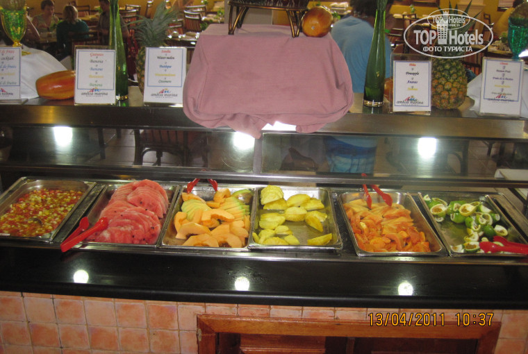 Добрый день! В общем, по-порядку. Заселили нас в №6208 прямо возле океана и рядом с основной столовкой (Лагуна). На близком расстоянии от океана все корпуса старые, соответственно, если для Вас важен номер, то берите подальше, там номера даже с джакузи. Но нас вполне все устраивало, да и в номер мы заваливались только спать. Пляж - песочек мелкий, волны большие прикольные, водорослей практически нет (в отличии от побережья соседних отелей) - в целом неплохо. С маской плавать смысла нет - смотреть не на что. Морские звезды можно увидеть только поехав на Карибское море на экскурсию на остров Саона. На пляже нет пепельниц и повсюду валяются бычки, которые по-моему не убираются вообще! Загорайте первые дни только в тени - солнце очень жестокое!!!На пляже можно воспользоваться бесплатно досками (не знаю как правильно называются), лодками и катамаранами с парусом (но если не умеете им управлять - обучение за деньги). Питание - на мой вкус очень даже неплохо! 2-3 вида мяса различного приготовления, курица, рыба (тушеная), морепродукты. Паста 3-х видов (даже моя любимая Карбонара), куча прочих гарниров. Овощи, фрукты - мандарины, ананасы, дыни, арбузы, манго, маракуйя и еще какой-то мне не известный фрукт. На завтрак фрешики (вернее если придирчевее сказать, коктейли на основе фрешей) - вкуснотища!!! Не перепутайте с юпи, имеющемся на розлив. Фреши только за барной стойкой - подходите и наливайте сколько угодно!!! Сервис хорош только в ресторанах, в баре на пляже Beach Bar (возле фирменного ресторана Таино), спортбаре (работает 24 часа там же и бильярд). В круглом баре Arena на пляже рядом с бассейном - ОТВРАТИТЕЛЬНЫЙ!!! В лобби - так себе. Горничные офигевшие, мини-бар (кола, спрайт), который должен пополняться хотя бы ч/з день, наполняли первые дня 3, потом просто забили. В принципе, пофигу, т.к. наливают везде))). Анимация обычная - всякие аэробики, пляжный волейбол и т.п. В целом - скучновато, если честно. Контингент, в основном, испанские бабульки, американско-канадская молодежь (бухают безбожно!!!). Русских очень немного, потому очень приятно слышать знакомую речь))). Общение с персоналом только на испанском или английском - по-русски они никак(((. Дискотека никакая, если Вам только не до 20 лет, одни америкосовские малолетки!!! Подытожу: мы с мужем ехали на ленивый отдых с валянием на пляже и купанием в океане + обжорство. Все и получили и приехали на родину отдохнувшими и загоревшими. Но больше туда не поедем))).