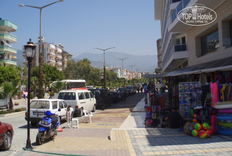 Отель очень удачно расположен. Вы живете в городе небольшом, можно свободно выходить, прогуливаться, скупляться, не отъезжая специально из отеля. Люди приветливые, можно не бояться, спокойно гулять по улицам. Там очень тихо, мирно, красиво. До Алании ездят маршрутки. Пешком можно дйти в ближайшие торговые центры. Все как унас. Даже "Метро" есть - так что можете брать карточку)