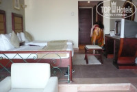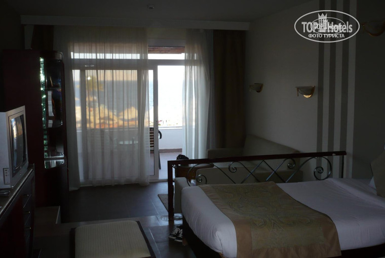 Очень повезло при заселении. У нас был оплачен стандартный номер с видом на море. Нас так и поселили в корпусе на первой линии, но на 1 этаж. Нам не понравилось на 1 этаже, т.к. по сути нет балкона, и мы пошли просить другой номер. Все корпуса в отеле 2-этажные, так что выбор не велик. Сначала нам сказали, что других вариантов нет, но мы не сдавались и в результате недолгих переговоров нам дали на 2 этаже номер Superior без доплаты. Номер отличный, большой, двухуровневый, с огромным балконом.