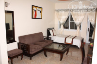Мы жили троём в Triple Studio, ок. 49 кв. м. Такой только 1 номер в отеле (есть ещё обычная Studio на 2-х.), в Трипл есть полноценная (а не дополнительная) Single bed + ещё одна одна Double bed. В ванной комнате есть туалет, ванна, душевая кабинка. Вид на море. Номер большой. Понравился. Встречали небольшой корзинкой фруктов. Термос с горячей водой можно заказывать на Ресепшн. При въезде сделали там перестановку - третью кровать переместили к балкону-стало значительнее комфортнее и стильнее.