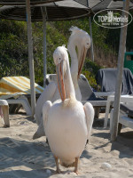 Отдыхали с мужем 10 дней в этом отеле с 19 сентября (самый сезон)! Поехали сразу после свадьбы! Туроператор- Натали турс! Работают люди просто отвратительно! При покупке тура очень просили сделать пометку что мы молодожены (так как читали что отель дарит подарки и вообще для молодоженов есть преимущества). По приезду в отель выясняется , что про нас никто ничего не знал, и натали турс никаких пометок не делал( Но девушка с ресепшена Наталья (которую тут многие почему то ругают) попросила нас подождать часик и сказала что постарается помочь! Нас угостили апельсиновым соком, мы пошли прогуляться по территории, а когда вернулись нас проводили в номер! Такого мы не ожидали! У нас был забронирован номер с видом на сад, а нас на все десять дней поселили в вип бунгало с видом на море на берегу пляжа без каких либо доплат! От номера до пляжа 3 метра)Муж с утра через балкон ходил на пляж занимать лежаки)))Номер большой, в нем огромная кровать, туалетный столик, шкаф, ванная, ступеньки на нижний уровень и там гостиная- огромный диван, два кресла, большой телевизор, и столик, ну и балкон конечно! В номере нас ждали шампанское, фрукты, цветы (розы), и красиво украшенная огромная кровать! На следующий день нам опять принесли фрукты и бутылку вина! Надо сказать мы заходили в номер с видом на сад, он меньше нашего где то в 2 раза если не больше, и там действительно очень сильная слышимость, в коридоре дверь в другой номер (в общем многие люди жаловались). Территория отеля просто роскошная! Все утопает в цветущих деревьях! Ощущение как будто ты живешь в райском саду! Пляж не плохой, море чистое, спокойное (мало волн, и не было водорослей)! Лежаки платные (помойму 2 евро с человека).Каждый день на пляж приходили два друга-пеликана))Такие они очаровашки! Это реально фишка отеля! Помимо них на территории живут попугайчики и множество кошек). Про бассейн ничего сказать не могу- не разу там не тусили (я так поняла у бассейна в основном отдыхают немцы, т.к. близко бар с алкоголем)! Питание было хорошее, большое разнообразие блюд, все очень вкусно, вода и напитки оплачиваются отдельно! Каждый ужин- тематические вечера (кухни разных стран). Меня покорили пончики на завтрак! Очень уж они были вкусные). Представителя от Натали турс мы практически не видели, девушка работала амерзительно, она не приходила в назначенное время в отель (время которое указано на общем стенде)! Чтобы заказать экскурсию нам пришлось ее разыскивать, так как даже к телефону она не походила, который сама же давала чтоб звонили в случае возникновения проблем и вопросов! Спасибо Наталье которая нам посоветовала заказать экскурсию у другого туроператора! Экскурсию брали- по следам Афродиты! Нам понравилось, нареканий нет, но было ощущение что цена сильно завышена! Еще по поводу Натальи. У нас была свадебная фотосессия и она помогла с букетом невесты и пригласила в отель стилиста, которая уложила мне волосы (надо сказать что стилист не понимала по русски, а я ее не понимала по английски, и Наталья все переводила и помогла нам понять друг друга! В результате я осталась очень довольна прической!) Ну и на последок не могу не написать, что в день вылета, Натали турс забыли нас забрать из отеля! Мы прождали 45 мин, потом начали звонить их представителю, которая опять не снимала трубку, и нам опять помогла Наталья! Которая до н