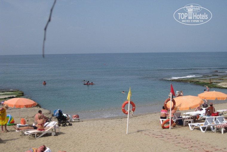 Песок в перемешку с мелкой галькой, зонтов и шезлонгов всем хватало - все в нормальном состоянии. Есть на пляже бар там соки (юпи, зуко,спрайты и пр.), и какой-то цветной лёд. Ходит мальчик-бич-бой и всегда готов помочь в установке зонта. Есть 2 душа, туалет М и Ж, и кран для мытья ног. Проход на пляж по подземному туннелю, в нем чисто (!), и ходят только отдыхающие отеля. На ночь он закрывается.