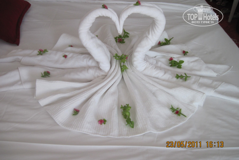 Добрый вечер!Ездили в этот отель с 17 по 27мая с мужем и ребенком год и 10месяцев.Выбирали конечно по отзывам.И вот решили остановится на нем,т.к в агентстве его нам расхвалили.Приехали мы туда в пол 5 утра,т.к ПЕГАС не знаю как его назвать слов просто плохих не собрать перенес вылет на 4часа вперед,слава богу до летели нормально,приехали в отель про сидели на ресепшене с маленьким ребенком до часу и только тогда нас заселили и то мы давали 10$ а потом уже 20 предлагали чтобы по раньше нас заселили но они отказались.Уже настроение было всё испорченно.Мы устали как не знаю кто.у ребеночка поднялась температура 39 я со слезами на глазах у них просила дайте нам где нить отдохнуть,но они нам говорили,что мест нет.Ну вот дали нам номер в начале второго.Номер хороший пусть не на море,но нормальный номер,убирались каждый день без всяких чаевых.муж потом уже стал оставлять, нам делали такую красоту из полотенец))))класс просто.Еда конечно мне не понравилась,кроме картошки фри,капучинно,и вкусняшек различных)))ребенок ел очень плохо, на завтрак кушал яйцо вареное,сухие завтраки горсточки если съедала и то хорошо и яблоки и нам на целый день.Так то еды было очень много,но на любителя.Итальянский ресторан вот мне там еда очень понравилась,а особенно пицца ням,ням))).Турки очень любят детей над моей дочкой они просто не могли пройти мимо))))В целом отдых я считаю удался я ехала не по жрать.а по купаться в море,по загорать я это в принципе и получила.Но в этот отель и в Турцию мне больше не хочется.