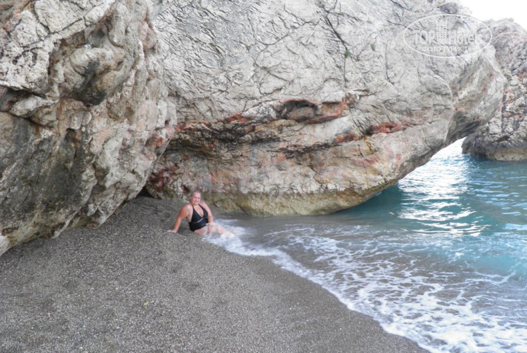 Пляж находится через дорогу, в 3х минутах ходьбы от отеля. Эта дорога превращается в большое удовольствие – красивейшие горы, огромные сосны, цветущие кустарники, пение птиц… Территория пляжа не большая, очень чистенько. Лежаков и матрасов хватает на всех. Заход в море – крупная галька ( лучше купаться в специальной обуви), поэтому вода около берега совершенно прозрачная. На пляже много развлечений – скутеры, банан, таблетка, парашют… За умеренную плату можно этим всем воспользоваться. Очень советую полетать на парашюте! Сверху открывается удивительный вид на весь Бельдиби, а если Вам повезёт – то можно увидеть дельфинов и морских черепах. Незабываемое зрелище!