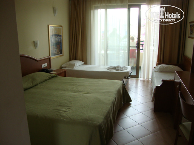 Номер нам понравился: просторный, с новой, добротной мебелью, с большой двуспальной кроватью и одной одиночной кроватью и раскладной кроватью. Места хватало, большое зеркало, шкаф купе, холодильник, санузел с новой современной сантехникой и феном для сушки волос. Кондинционер хорош, управляется из номера, но работает только с закрытыми дверьми на балкон и вход.