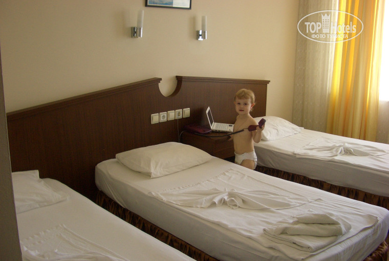3. Номера в отеле среднего размера. Нам втроем было вполне комфортно. На полу ковровое покрытие. Есть огромный балкон, где приятно посидеть вечером, наблюдая анимационные программы, если дети уже спать захотели. В номере есть телевизор, холодильник, санузел (умывальник, унитаз, ванна с душем, фен). Уборка производится ежедневно, полотенца и белье меняются по мере необходимости. Мы просто складывали на пол белье к замене и получали все в чистом виде, вернувшись в номер.