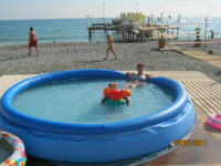 Пляж хороший, вода чистая прзрачная, вседа есть лежаки, зонтики, маленькие столики. Для детей большая песочница, всегда можно полить её водой из кранчика, игрушки можно не брать, были и вёдра и лопатки, ребёнок ни в чём не нуждался!