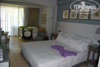 Номер у нас был отличный, Джуниор сьют, он чуть больше стандарта за счет небольшой гостевой зоны, в номере все, как заявлено, халаты, тапочки, кофеварка, чайник, минибар, сейф, фен отличный, весы в ванной, ванна с душем каскадным и обычным, хорошие туалетные принадлежности - гель, шампунь, мыло, молочко для тела, кондиционер очень вкусно пахнущие. Вид нам дали на море в корпусе Б, хотя сиа вью не заказывали. У ребят, с кем мы ездили ( а нас было еще три семьи с детьми в этом отеле, еще семья в Клабе, мы в ресторане заказывали столик сразу на 15-18 человек))), был стандарт и вид на бассейн тоже в корпусе Б, вид ничуть не хуже, а мне показалось даже лучше у них, т.к. с 5-го этажа открывался потрясающий вид на бассейн и море, т.е. боковой вид на море, супер красота! А у нас только на море со второго этажа, опять же зато тихо и шум волн - релакс в общем! На первом этаже под нами такие же номера только с выходом к морю, со своим как бы садиком, отличие только в том, что удобно прямо с балкона или террасы вернее направляться к морю или на травке на шезлонге расположиться, тут же дети играют, пока ты в номере, по идее удобно, мы так в Турции отдыхали, только там не было доплаты такой приличной, как здесь. Здесь это особая категория номера, и разница в цене немаленькая. Минибаром не пользовались, кофе в таблетках разного вида, чаи, сахар приносили постоянно вначале, к концу отдыха почему то стали про нас забывать, пришлось звонить на ресепшн, так в один день так и не принесли после нашего звонка, в другой день снова звонили дважды прежде, чем принесли. Странно. т.к. во всем остальном все быстро и оперативно было, сервис на отличном уровне. Стоило спросить про ванночку детскую для малышки, так сразу ее принесли в номер, кроватка для нее тоже была сразу поставлена, а старший спал на диванчике. Рум сервис тоже быстро приносил еду. Убирались хорошо и что очень приятно удивило, меняли полотенца и урны дважды в день, утром и вечером. Горничная очень приятная женщина, мы приходили днем с пляжа и было все убрано и поменяно, чисто и аккуратно.