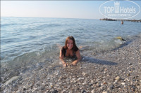 До пляжа идти минут 5-7.Совершенно не напряжно,а,как кто-то написал,даже полезно.По пути можно купить пляжные полотенца,матрасы,мороженное и пр.Пляж галечно-песчаный.Вход в море - крупная галька.Кто-то писал про булыжники.Так вот,там действительно есть большие камни,НО!Много дорожек для входа в воду,они на берегу обозначены камнями,но ним заходить очень просто,и не нужно никаких тапочек,стоит только приноровиться - и вуаля.Мы вообще заходили по колен,а затем плыли.Дальше камни крупные,на них удобно стоять. У нас напрягов эти пункты не вызывали,т.к. благодаря гальке,море было кристалльно чистое.Кто возмущается чистоте пляжа - дорогие мои туристы,так вы же сами его и загрязняете!!!Окурки,шелуха от