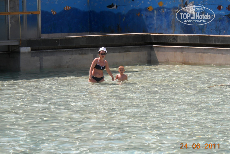 Бассейн - бесплатно. Не большой, но и не маленький. Чистили при нас 2 раза. Вода приятная, пресная. Не понравилось то, что мало лежаков (на память - 6-7 штук). Впрочем наличие моря рядом это исправляло.