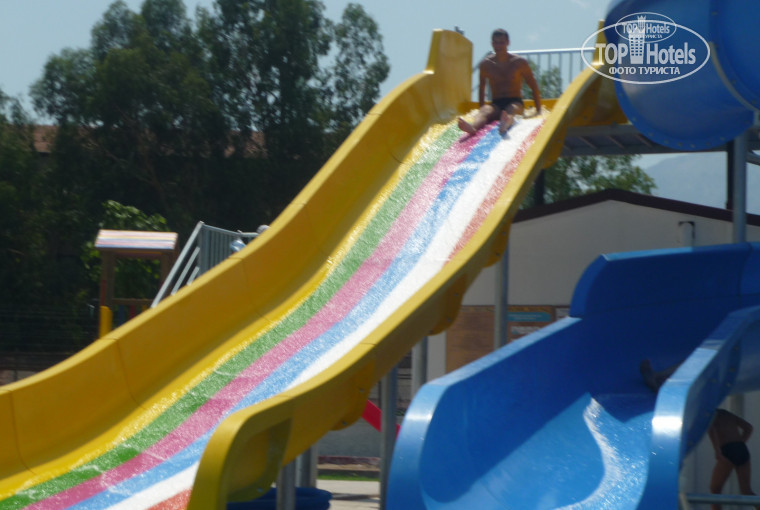 Бассейн отличный большой,мы оттуда почти не вылазили. Жалко только, что под конец нашего отдыха много хлорки использовали. Есть горки две,парень мой умудрился на синей распороть себе немного бок о швы.На море ходили не часто,не знаю почему,лень не пускала наверное:) Море конечно относительно не далеко 5-7 мин медленным шагом,пляж маленький,но лежаки были всегда,даже в первых рядах. Парень мой прыгал с соседнего пирса без проблем,никто не выгонял его. Бара бесплатного нет.