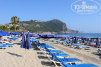 Пляж песчано-галечный, чтобы не обжигать ноги на нем сделаны дорожки из деревянных палочек, каждые метров 50-100 стоят душевые с пресной водой. Если лежать на песке, то бесплатно.