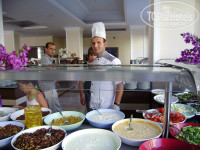 Это отдельная история. Невозможно всё перепробывать! Столько еды! Отдельные столы с овощными салатами видов 10, салаты со сметаной, майонезом (видов 10), фрукты ежедневно!!!(арбузы, дыни, яблочки, слива, виноград, персики, абрикосы, ещё что-то). Дыни просто медовые были! Очень люблю дыню, муж на арбузы налегал. Если что-то заканчивалось, то проворные официанты тут же доносили, ставили, докладывали.