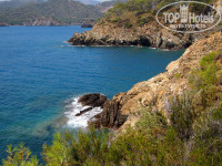 Пляж - песок,вход в море - крупная и средняя галька,далее только чистейший песок. Мы заранее запаслись коралловыми тапочками(они недорогие,в Спортмастере- 600р.) и никаких проблем с передвижением по каменюкам у нас не возникало. Отель в этом месте - единственный на побережье, ходили гулять в горы, они находятся справа, идти минут 20,у подножия горы дикий пляж - турки пикники устраивают,шашлык-машлык и т.д. Поднимались на первую горку- очень красивые виды, внизу какие то гроты, подобраться ближе не решились. Цикады(?) стрекочут - уши закладывает. Рядом с пляжем речка впадает в море, турки ловят там на голый крючок какую то красивую рыбеху крупную.