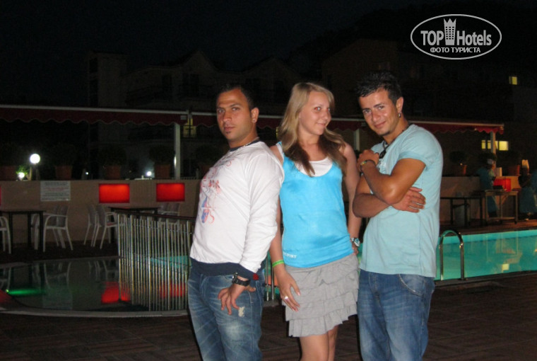 Отдыхали с 10 июля 2011.ОТдыхала с 16_летней дочерью.отель очень понравился.Отель маленький, но уютный. Приехали в отель в 13:30, сразу пошли на обед,как только вернулись,сразу заселили в корпус С.номер уютный, ежедневная уборка, всегда красиво свернуты полотенца. Побывали в Хамам(это Турецкая баня) очень понравилось. Познакомились с аниматорами:Ричи, Ибрагим, Настя и Света. Самый веселый Ибрагим всегда улыбался и поднимал всем настроение. Жаль не знаю как зовут парня, он сидит на пляже и в турецкой бани, очень хорошо говорит по-русски.Кто знает пожалуйста напишите.