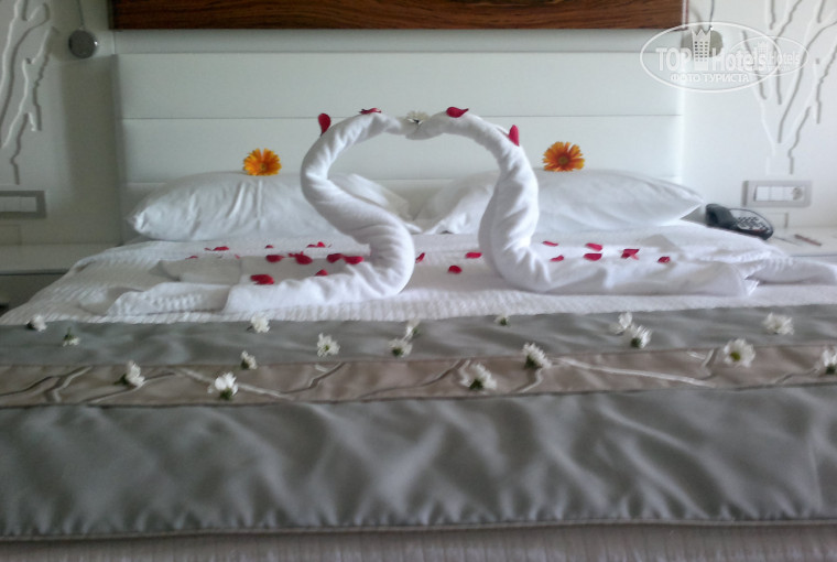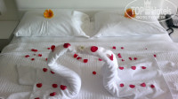 Номер просторный, светлый. Мебель, сантехника, бельё все новое и красивое. Так как мы были молодожёны, номер был украшен соответственно: на кровати в лепестках красных роз плавали два белых лебедя из полотенец, выглядело это потрясающе. Через минуту в номер постучали, я открыл и опять был приятно удивлен на пороге стоял посыльный с красивым букетом цветов (кстати цветы простояли всю неделю и не завяли). Еще через пару минут в номер опять постучали, я открыл и увидел двух официантов которые принесли корзину фруктов (бананы, яблоки, персики, абрикосы, сливы, два вида винограда, инжир), бутылку шампанского в ведерке со льдом, огромное блюдо с разнообразными сладостями и креманку с множеством видов орешков. На этом в принципе можно было бы и закончить нас баловать, но через пол часа раздался телефонный звонок, и приятный женский голос на чистом русском языке сообщил нам что это Guest Relation Maneger Татьяна, и что она очень извиняеется что не смогла нас встретить так как была на совещании. Так же она сообщила нам что по концепции отеля молодоженам после первой ночи завтрак подается в номер, и поинтересовалась в котором часу мы хотели бы его завтра получить. Затем она пригласила нас спустится к ней на рюмочку кофе, в удобное для нас время для ознакомительной беседы. Мы спустились, официант сразу же принес нам по коктейлю, и Татьяна расказала и показала что где находиться и ответила на все наши вопросы.