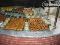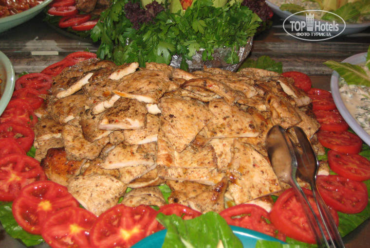 Еда -обычный стандартный шведский стол как и везде в отелях турции. Не верти тем кто говорит что мяса нет!, Мясо есть но,конечно это не говядина-баранина и свинина, а курица и индейка, а еще бывает рыба. Много зелени и салатов. Горячие обычно 4 вида, очень вкусные баклажаны попробуйте обязателно!. Кстати суп-для Турции в этом отели очень вкусный, они даже борщ попытались сварить-МОЛОДЦЫ), тоесть еда - есть можно, вкусная брынза-очень, на завтрак даже предусмотрен мини гриль(вафельница, для горячих бутербродов.) Рядом много ресторанов где есть всегда мясо баранина и говядина не дороже 25$ за порцию , мы ели очень вкусно-пальчики оближешь даже подскажу название одного кафе "Интернационал" это нужно идти до часов и сразу его увидете. там еще кстати за 8$настоящий мясной бургер с гарниром картофель по деревенски -на вкус супер!напитки не дорого почти как в магазине.