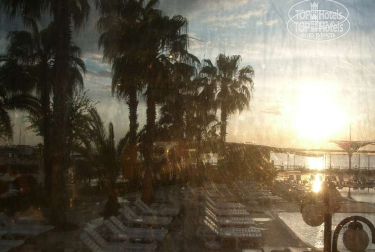 Достался угловой номер впритык к другому такому угловому номеру, с видом на "задворки" - водные горки и детский бассейн. Как выяснилось позже, это оказалось плюсом, т.к. вначале нашего прибывания температура воздуха была порядка 20-25 градусов, но позже она поднялась до 30-36 градусов, но к нам в номер солнце практически не проникало, и с кондиционером (а так же соплями и простудой) столкнуться не пришлось.