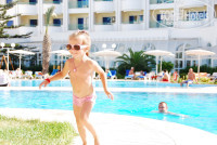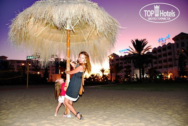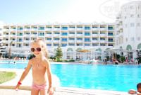 Теперь один из самых главных минусов: ЕДА. реально на троечку, особенно будете замечать этот недостаток, если отправитесь на отдых с детьми. еда перченая, ооочень жирная.в масле плавает. только несколько раз давали печеный картофель в фольге, дочка уплетала за обе щеки. супы несъедобные. морепродуктов не было. курицы и мяса много, но еда всё равно однообразная: овощи гриль -( помидоры, кабачки, баклажаны, грунтовые зеленые перцы). макароны, рис. фрукты: яблоки, сливы, иногда персики и виноград, арбузы, дыни. утром - кофе, какао, чай. обед и ужин - минеральная вода, ужасные соки Юпи и тунисская газировка, вино и пиво. вкусный кофе в лобби. еда - самообслуживание (шведский стол), напитки брать нельзя, приносят официанты (на обед и ужин) и как уже было сказано не раз в других отзывах, готовьте динары. тогда Вы получите напитки к еде и не будете портить свои нервы в ожидании. из спиртного пили вино красное и белое. очень хорошее, из бутылок, но наливают совсем понемногу. так что с официантами надо дружить. мы садились всё время за один столик, официанту давали в день по динару и получали за это отличное и быстрое обслуживание. кстати, вкусная пицца, булочки на утро. выпечка обинаковая каждый день, вполне съедобная, было мороженое, но мы не пробовали. главная проблема заключалась в воде - она вся соленая, и даже когда пьешь чай или кофе, чувствуется привкус. берите детям соки из дома, не пожалейте места в чемодане!!!!!!!!!