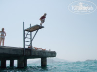 5. МОРЕ. Очень солёное. Много читал, что вход в воду очень каменистый и купил ребёнку специальную обувь. И что? Один раз одел, и лежали они потом на балконе. Там пирс есть с вышкой. Вот оттуда и ныряли. Вход в море не такой уж и ужасный. Кстати вышка примерно 3,5 метра. Есть лесенки для входа в воду с пирса прямые и под углом. Ближе к вечеру вода помутнее и траву прибивает к берегу. Но это всё ерунда. Морских ежей не видел.
