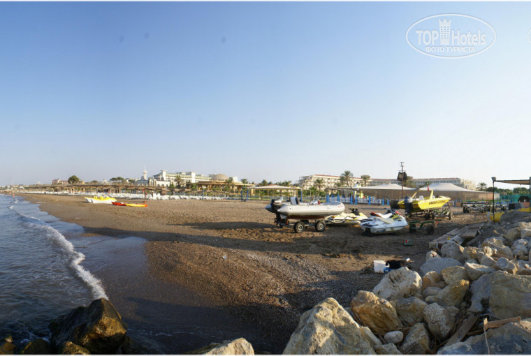 Территория реально огромная. Зеленая, ухоженная. Огромный песочный пляж, со всеми удобствами. Вход пологий, песочный, неглубоко (порядка 1,50 м на расстоянии 30 м): в нашем случае огромное преимущество: я на удалении от берега мог спокойно присмативать за купанием моих детей у самого берега и сам наслаждаться морем. Поблизости впадает река, чистая. Перемешиваясь, лишь изредка ощущал холодные струйки, что, впрочем, не так уж и плохо. Два больших бассейна с разными глубинами. Водные горки, безопасные, однако, достаточно высокие и крутые, чтобы получить удовольствие. Не всегда, но большую часть времени, присутствуют Safe Guards как на море, так и на горках.