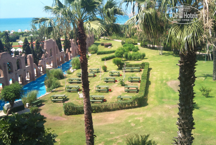 Мы жили в главном корпусе 1 в правом (от входа в отель) крыле. Вид из окна приятный: лужайка на которой проводились вечером bbq вечеринки, море и соседний отель "Белконти". Вид из окна в других корпусах, боюсь, разочарует. Есть, например, корпус с видами на стену, разделяющую отели или с видами на соседний корпус.