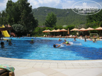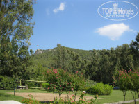 Территория отеля небольшая, очень много зелени и прекрасный вид на горы. Есть детская площадка и "лягушатник".
