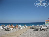 До моря минут 5 наверное. Пляж собственный метров 15-20, но достаточно. Проживающих мало, места хватает всем. Лежаки, матрасы-бесплатно. Душ у кафе. При входе стоит кулер с водой и ещё чем-то. Пляж-галька, вода чистая, рядом пирс, но от др.отеля.