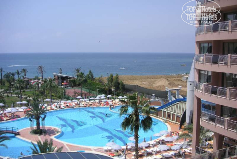 Отличный отель, соседние отели - Леодикия (открытие - май 2007), Сидера. Все отели имеют схожую территорию и инфраструктуру. Территория отеля не маленькая, хотя и не такая уж огромная, но погулять есть где, все очень зелено, 1 линия, пляж - песок 150 м. Отель работает по системе UAI, сервис - 24 часа в сутки, 2 а-ла карт ресторана, рыбный и турецкий, 1 раз в неделю бесплатное посещение. Основное здание: стильно оформленные коридоры; Стандартный номер - 35 м, очень хорошая обстановка, 2-х комнатные семейные номера - 2 спальни, максимум 5 человек, мини бар заполняется по приезду, сейф - 2 евро в сутки, во всех номерах ковры и ванные комнаты, ЕСТЬ НОМЕРА С ВИДОМ НА СТРОЙКУ. Для детей - мини клуб, детский стол в основном ресторане и детское меню, няня 20 евро в час, русскоговорящая. Анимация есть на русском, веселая, соскучиться не дадут. Услуги -SPA, бесплатные баня, джакузи, диско Бассейны: крытый, открытый, детский, 3 водные горки. Контингент туристов 50/50 наши и европейцы.