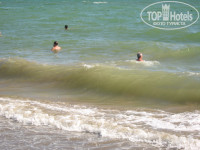 В зоне прибоя около 1 метра гальки, а дальше опять песок. В наш приезд дней 10 были волны. Из-за этого вода очень мутная от песка, зато на волнах попрыгать здорово)))