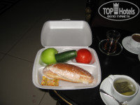 Обычно это: маленький сок, сэндвич, фрукт, кекс…, приборы и салфетки. А то получилось, на тебе боже, что нам негоже. Фото в приложении.