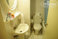 Теперь санузел. Скажу сразу, в нашем номере, а это 3 этаж, сантехника вся старая. Нет, всё работало как надо, но… плитка старая, местами отошедшая от стены, умывальник и унитаз ещё со времён, наверное, Ричарда Львиное сердце ))), потолок из крашеного металлического сайдинга, местами проржавевший, на полу следы, то ли высохшей замазки, то ли герметика. Дверь в санузел снизу разбухла от сырости и краска обкалупалась. Как пользоваться смывным бачком, я разобрался не сразу, там такой рычажок, который, для смыва воды, надо энергично опустить вниз. Если это будет не энергично, вода не потечёт. В общем, номер представлял из себя далеко не то, что так красиво показано на сайте «Пегаса».